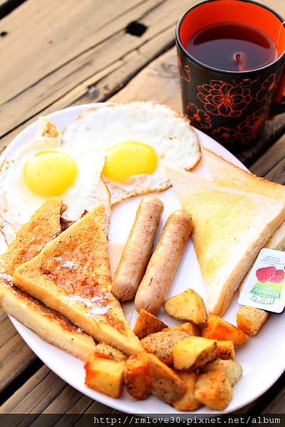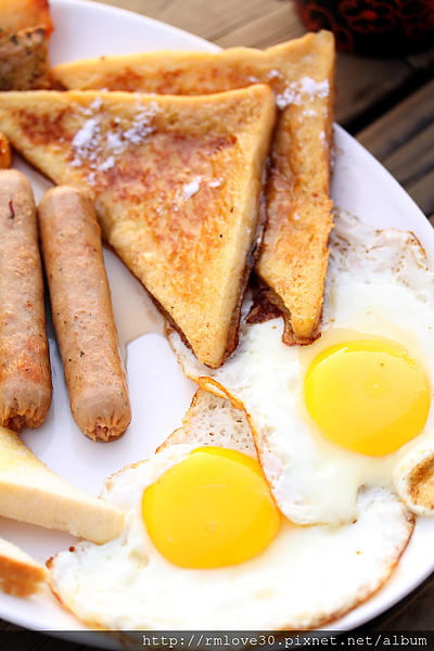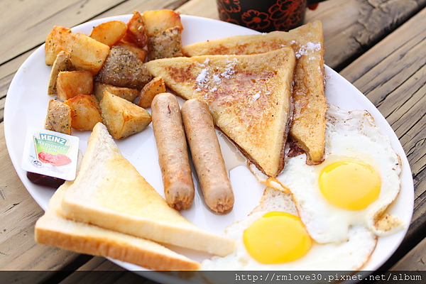 什麼都是兩份,兩條熱狗,兩顆荷包蛋,兩片土司(一片法國土司一片白土司可加果醬)